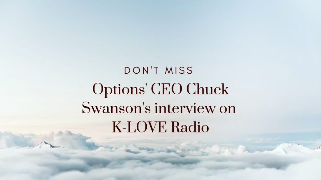 A principios de este mes, nuestro propio Chuck Swanson fue entrevistado en la radio K-LOVE sobre la labor de salvar vidas del ministerio de Options. Por si te perdiste la emisión en directo, te ofrecemos la oportunidad de escuchar la entrevista de 30 minutos de Chuck en su totalidad directamente desde nuestro sitio web. Haz clic en la flecha de abajo para enterarte de las novedades de Options y de cómo Chuck está guiando a Options hacia el futuro con más que una pequeña ayuda de Dios y de todos vosotros. Echa un vistazo más de cerca a Opciones para la Mujer. ¡Escucha ahora!